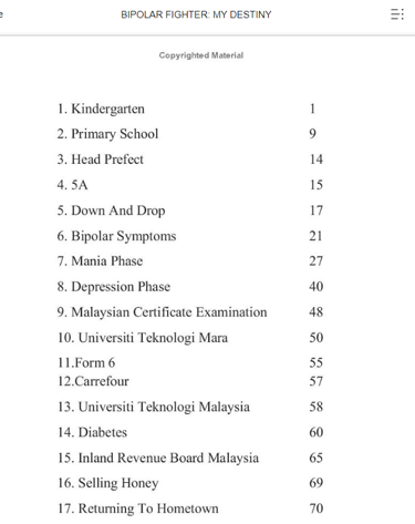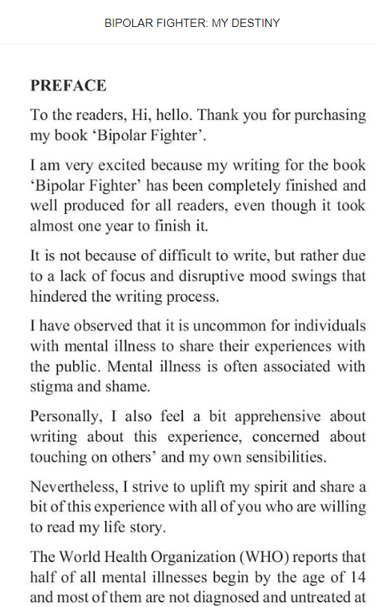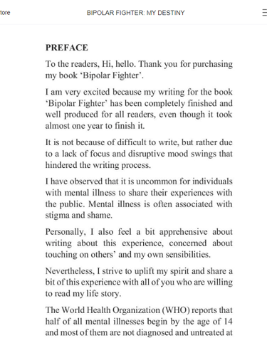 "I have simplified my decades-long life story as a bipolar disorder patient into a single book. Get it on Amazon to support the survival efforts of bipolar patients."